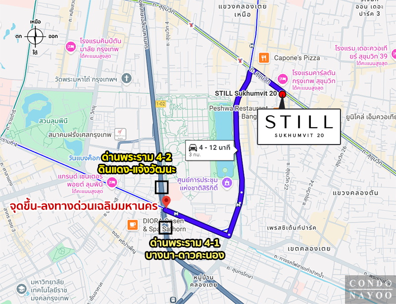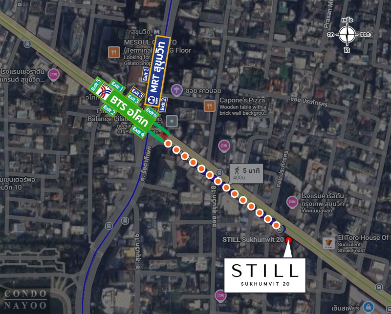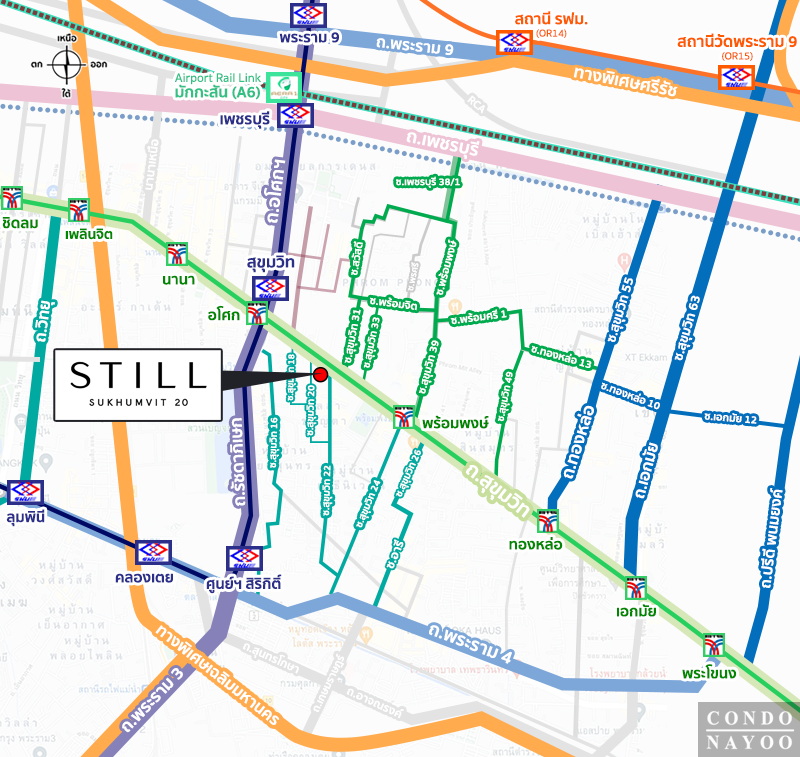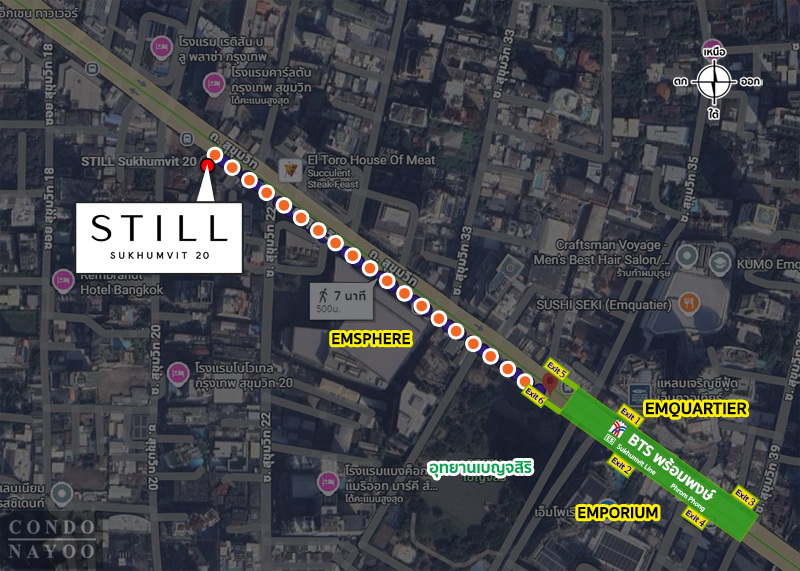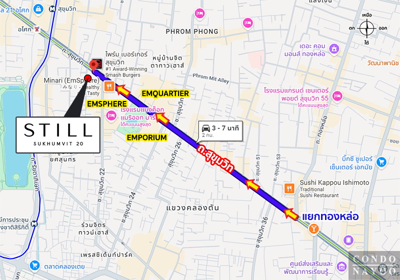 แยกทองหล่อ ⇒ ถนนสุขุมวิท ฝั่งขาเข้า ⇒ BTS พร้อมพงษ์ ⇒ EMSPHERE 200 ม.* ⇒ ถึงโครงการ STILL สุขุมวิท 20 ทางฝั่งซ้ายมือ ติดซอยสุขุมวิท 20*
