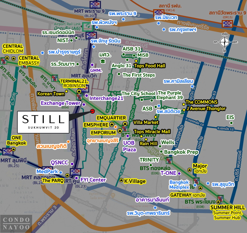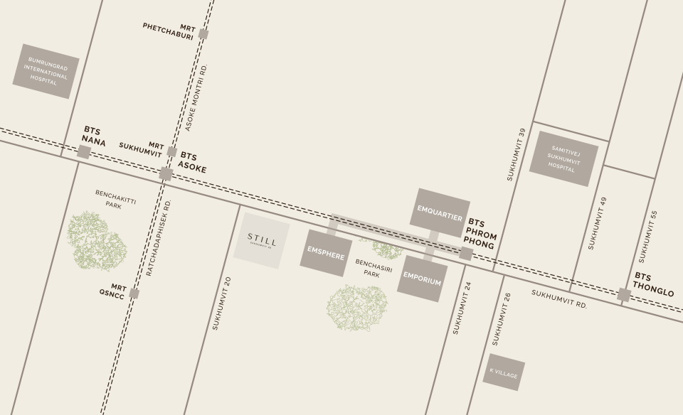 STILL สุขุมวิท 20 ตั้งอยู่ในหัวใจย่านเศรษฐกิจของกรุงเทพฯ รายล้อมด้วยอาคารสำนักงานเกรด A ชั้นนำ ทั้ง Exchange Tower, Interchange 21, FYI Center, T-One Building และ The PARQ ทำให้ที่นี่เป็นที่พักอาศัยที่ตอบโจทย์ทั้งผู้บริหาร มืออาชีพ และผู้ที่ต้องการเดินทางไปยังอโศก สุขุมวิท พระราม 4 หรือพระราม 9 ได้อย่างคล่องตัว