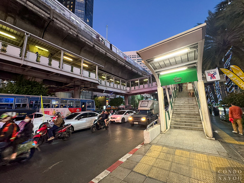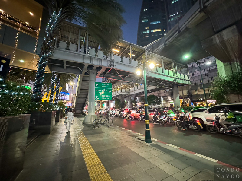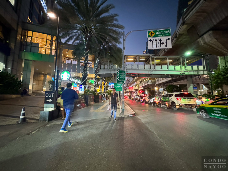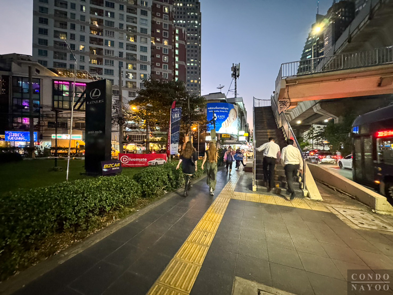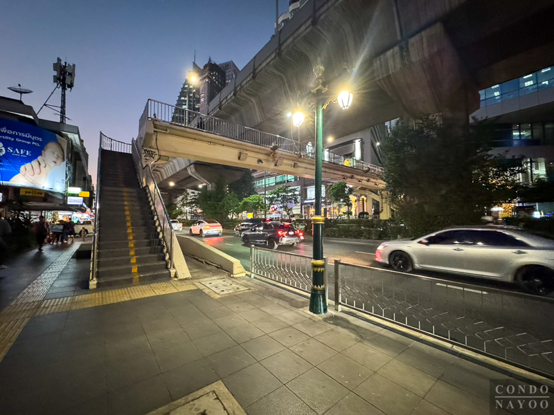 ตรงขึ้นมาจะเจอกับแยกอโศก และบันไดทางขึ้นไปใช้รถไฟฟ้า BTS อโศก แบบที่ไม่ต้องข้ามถนนด้านล่างค่ะ