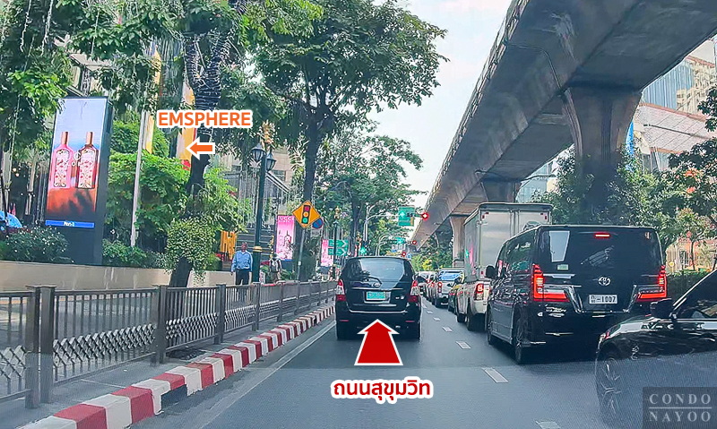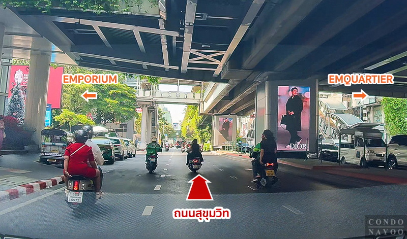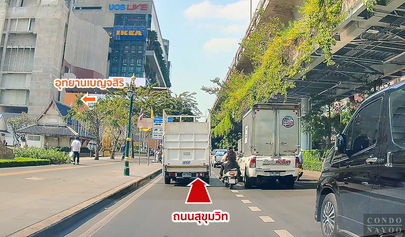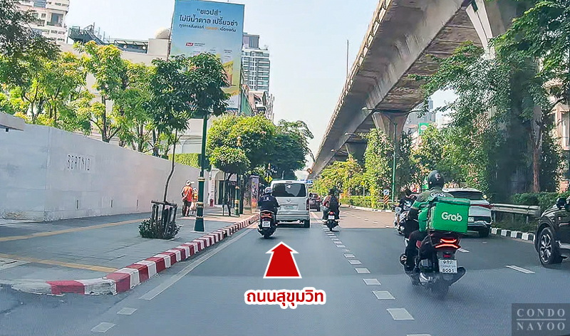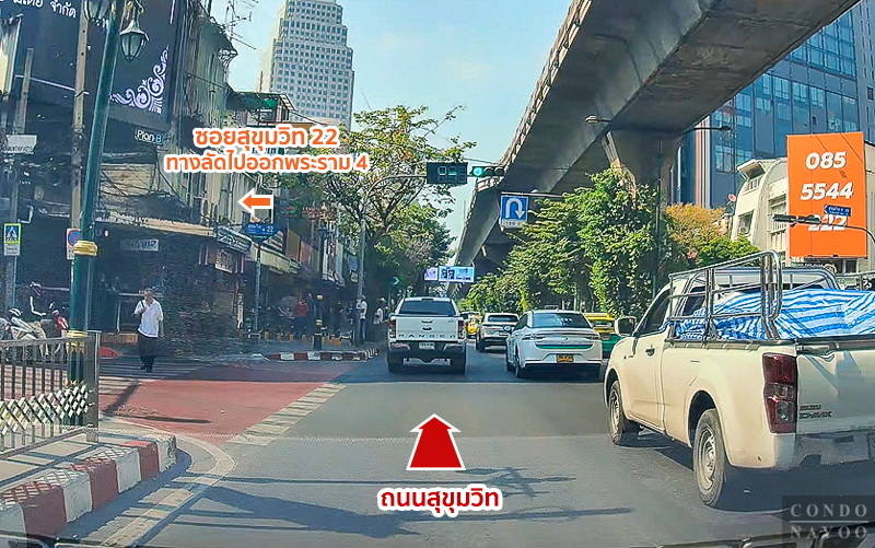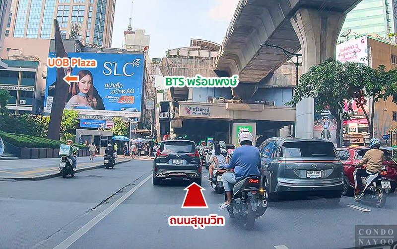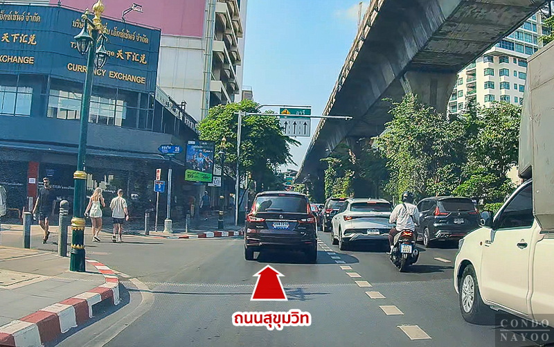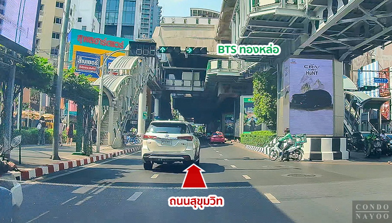ขับตรงไปบนถนนสุขุมวิท ฝั่งขาเข้า ผ่านโครงการ BEATNIQ สุขุมวิท 32 ขึ้นไป