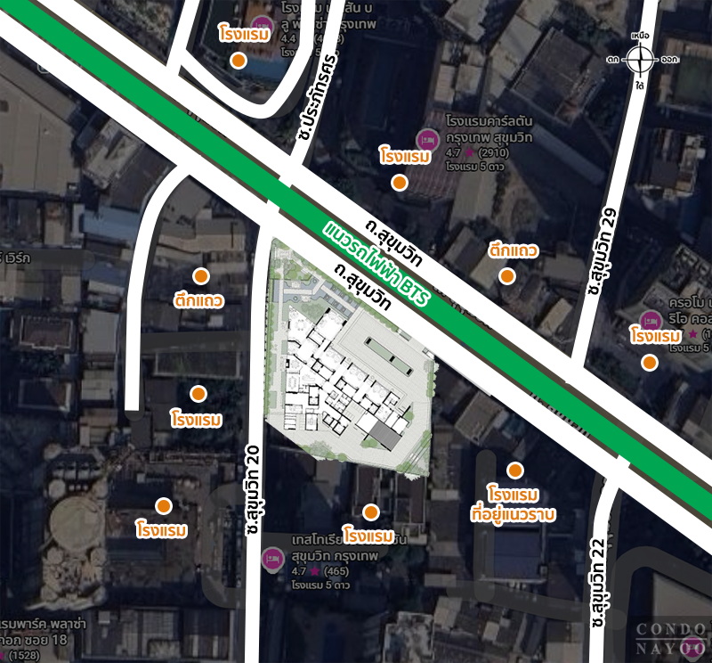 การเดินทางโดยรถส่วนตัว : ทำเลของโครงการเรียกว่าอยู่ใจกลางสุขุมวิทเลยนะคะ ที่ตั้งของโครงการจะมีทางเข้า-ออกอยู่ทางฝั่งถนนสุขุมวิท ฝั่งขาเข้า ระหว่างซอยสุขุมวิท 22 และซอยสุขุมวิท 20 จากโครงการสามารถขับตรงไปตรงแยกอโศก เชื่อมสุขุมวิทตอนต้น ออกไปเพลินจิต ชิดลม เดินห้างระดับ Word Class ด้านนั้นได้