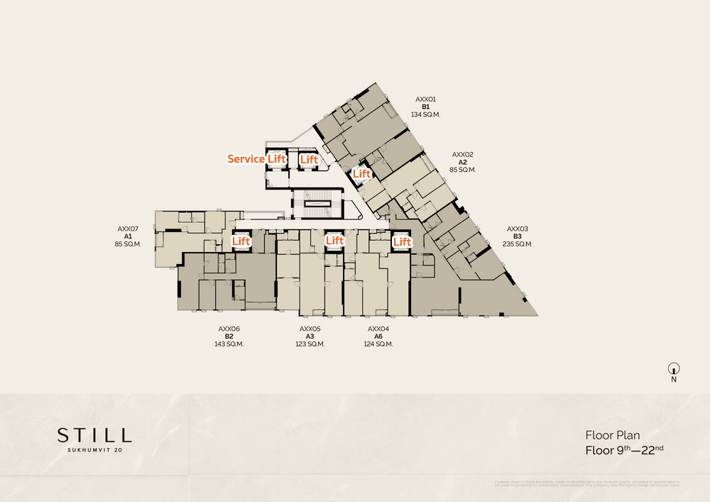 แปลนอาคารชั้น 9-22 ที่เป็น Typical Floor จะได้ความเป็นส่วนตัวมาก ๆ เพราะมีห้องพักเพียงแค่ 7 ยูนิต/ ชั้น โดยห้องพักของที่นี่จะเริ่มต้นเป็งห้องใหญ่ ขนาด 2 ห้องนอน เป็นต้นไปค่ะ