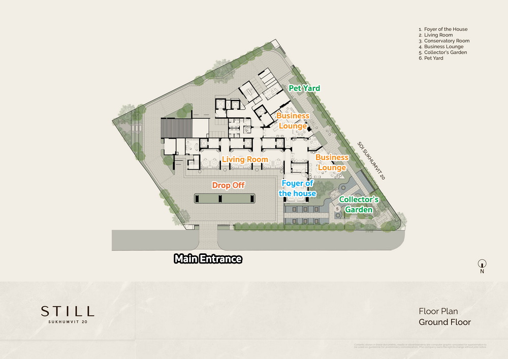 แปลนอาคารชั้น 1 เข้า-ออกโครงการได้เลยจากถนนสุขุมวิท ผ่านเข้ามาด้านในจะเจอกับ Drop-Off เชื่อมต่อกับ Foyer of the house, Collector’s Garden และ Pet Yard ที่เป็นพื้นที่ของสัตว์เลี้ยงได้ที่ด้านข้างอาคาร ส่วนด้านในอาคารจะประกอบไปด้วย Living Room ที่แยกมาให้ถึง 3 ห้อง มี Business Lounge ไว้สำหรับติดต่อ คุยธุรกิจได้แบบส่วนตัว พร้อม Loft Hall แบบส่วนตัว ที่จะเชื่อมตรงสู่ห้องพักทุกยูนิต ซึ่งจะแยกไว้ทั้งหมด 5 ตัวค่ะ