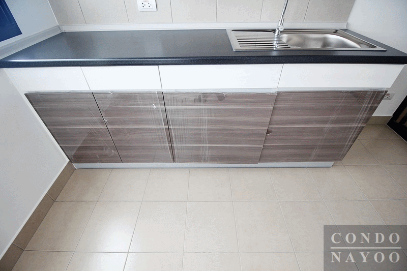 ด้านล่างเป็นตู้เก็บของ หน้าบานเป็นลามิเนตลายไม้สีน้ำตาล ส่วนชั้นที่ติดกับเคาน์เตอร์จะมีเพียงช่องตรงกลางเท่านั้นที่เปิดใช้งานได้ โดยเปิดมาก็เป็นลิ้นชักไว้เก็บช้อน-ส้อม