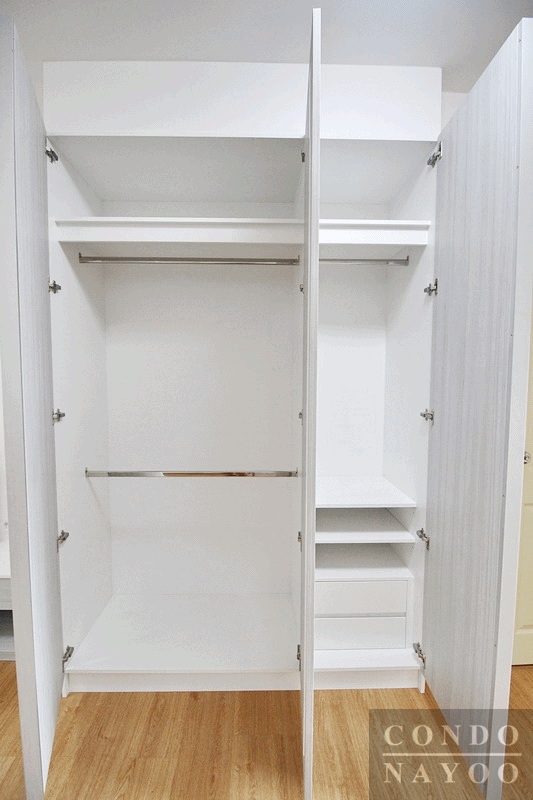 พื้นทีภายในตู้แบ่งเป็นสัดส่วน มีพื้นที่เก็บของหลายส่วนและเพียงพอต่อ 2 คน หน้าบานเป็นกระจกเงาบานใหญ่สะดวกต่อการแต่งตัว