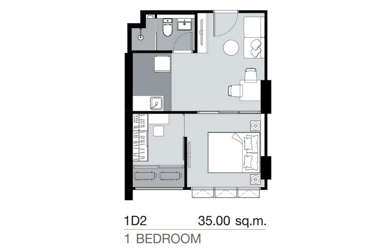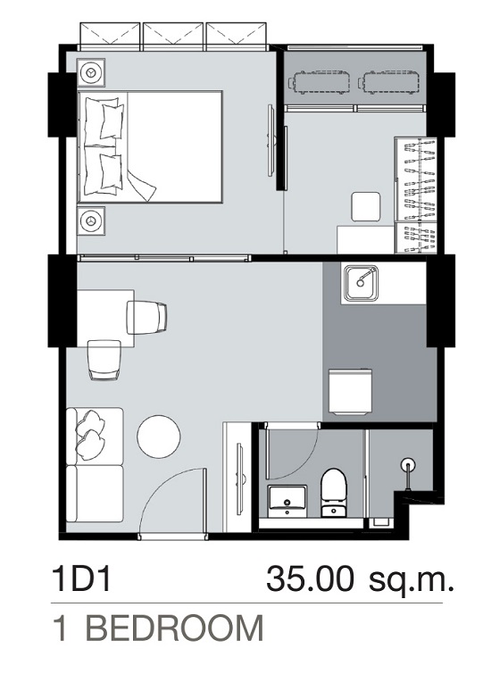 แปลนห้องตัวอย่าง TYPE 1D1 เป็นห้องพักแบบ 1 Bedroom ขนาด 35.00 ตร.ม. ที่เป็นห้อง 1 Bedroom ขนาดใหญ่ที่สุดของโครงการ ฟังก์ชันการใช้งานภายในห้อง ถูกออกแบบมาได้อย่างลงตัว รองรับการใช้ชีวิตแบบเดี่ยว และ แบบครอบครัวเริ่มต้นได้สบาย ๆ เปิดประตูเข้ามาภายในห้อง จะเจอกับห้องนั่งเล่นขนาดใหญ่ และ มุมทานอาหารขนาด 2 ที่นั่ง ต่อเนื่องไปทางขวามือจะเจอกับครัวเปิด และ พื้นที่สำหรับวางเครื่องซักผ้า ติดกันเป็นห้องน้ำแบบหน้ากว้าง ที่ภายในแบ่งส่วนแห้ง และ แยกส่วนอาบน้ำมาให้เรียบร้อย