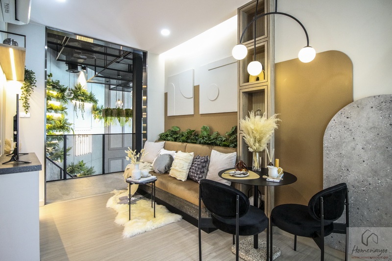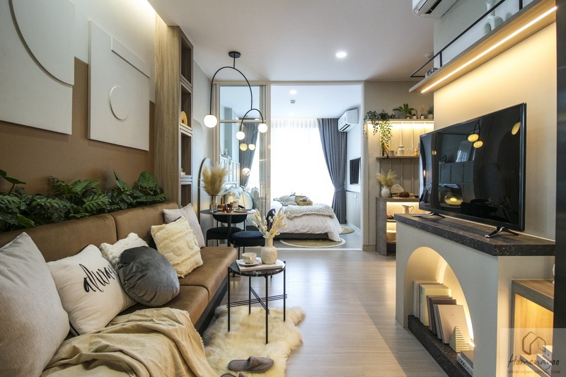 ห้องนั่งเล่นได้พื้นที่มาค่อนข้างกว้าง สามารถวางโซฟา ขนาด 3-4 ที่นั่ง และ ใช้พื้นที่ที่เหลือจัดเป็นมุมทานอาหาร ขนาด 2-3 ที่นั่งได้สบาย ๆ