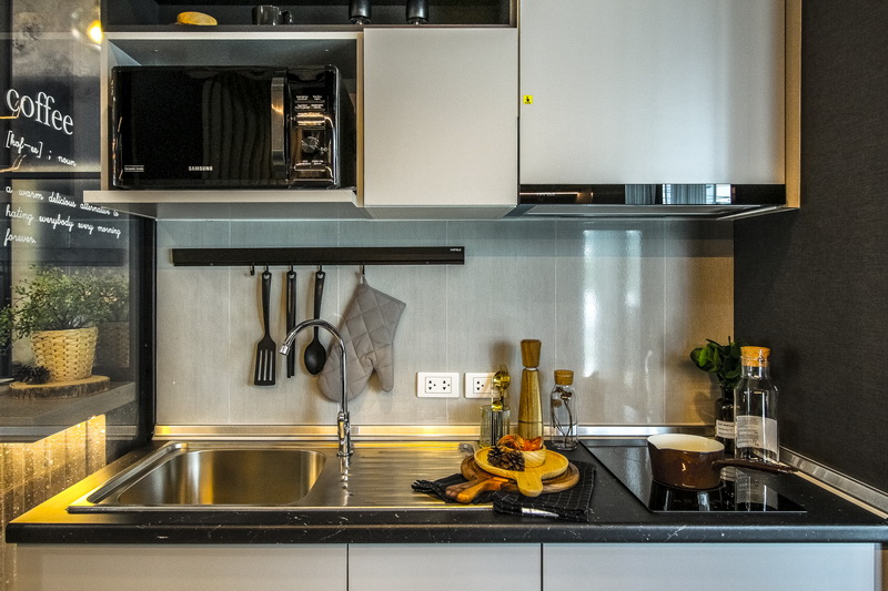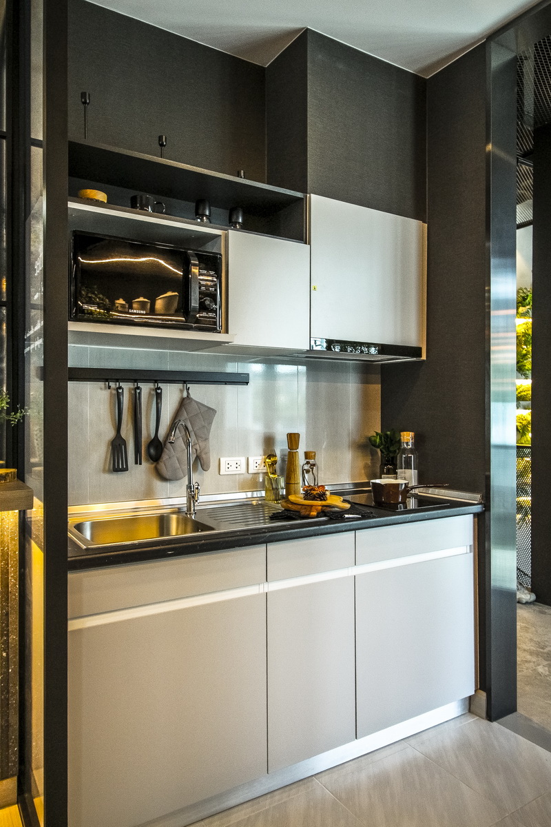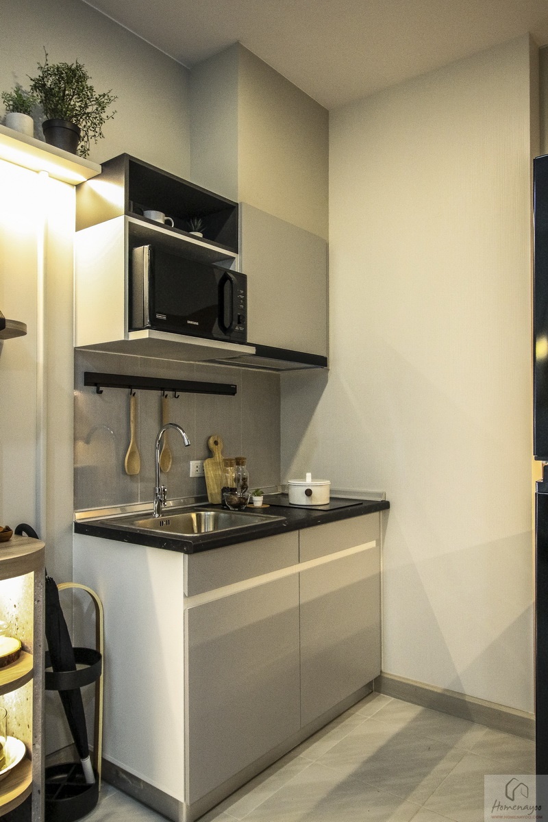 ชุดครัวที่ได้วัสดุเดียวกันกับห้องก่อนหน้านี้ แต่ห้อง 1 Bed Plus จะมีขนาดใหญ่กว่าอยู่ที่ 1.6 x 0.60 เมตร หน้าท็อปและหน้าบานตู้เป็นเมลามีน ผนังทำ BackSplash กันเปื้อน พร้อมติดเต้าเสียบปลั๊กไฟมาให้เรียบร้อยค่ะ