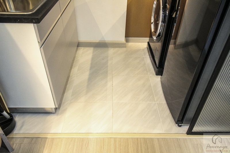 ในส่วนของพื้นห้องครัว จะถูกเปลี่ยนจากพื้นลามิเนต มาเป็นพื้นกระเบื้องเซรามิกลายหินสีเทา 40 x 40 ซม. ซึ่งจะเหมาะกับการใช้หนักมากกว่า และ ช่วยในเรื่องของการเช็ดล้างทำความสะอาดได้ง่ายขึ้นค่ะ