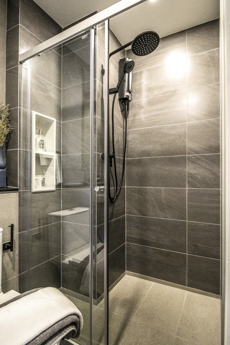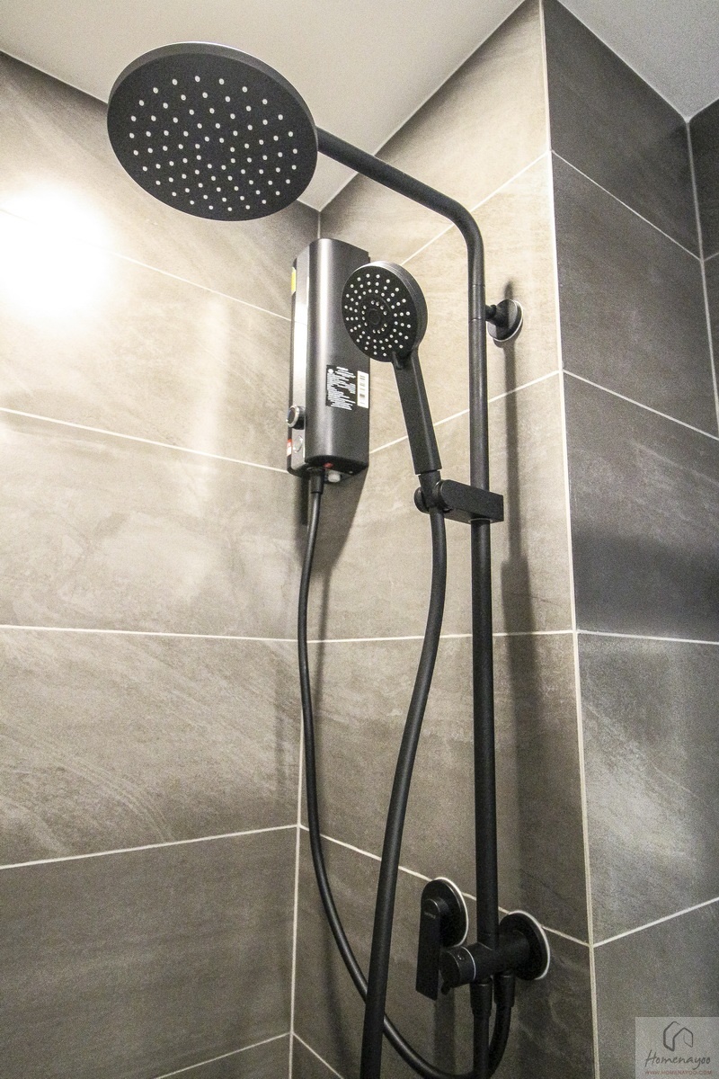 ด้านในติดตั้งฝักบัว Rain Shower + Hand Shower โครเมียมสีดำ พร้อมราวปรับระดับสูง-ต่ำ ก๊อกน้ำฝังผนังแบบก้านโยกของ Hafele ผนังด้านบนติดตั้งเครื่องน้ำอุ่นของ Stiebel Eltron มาให้เลยตามนี้ค่ะ