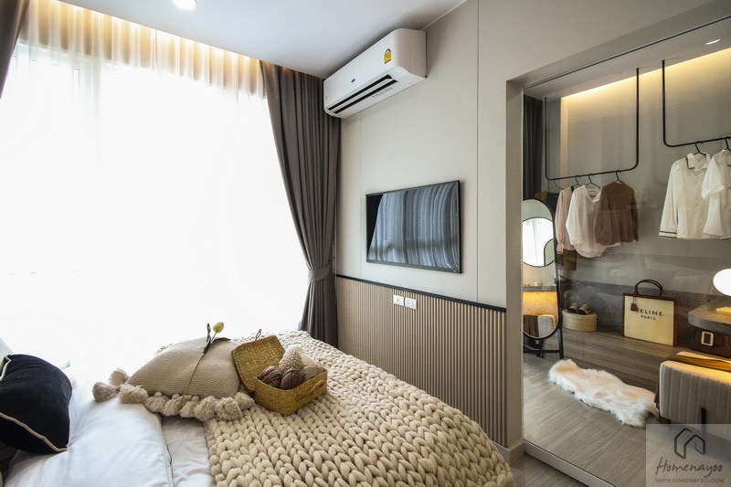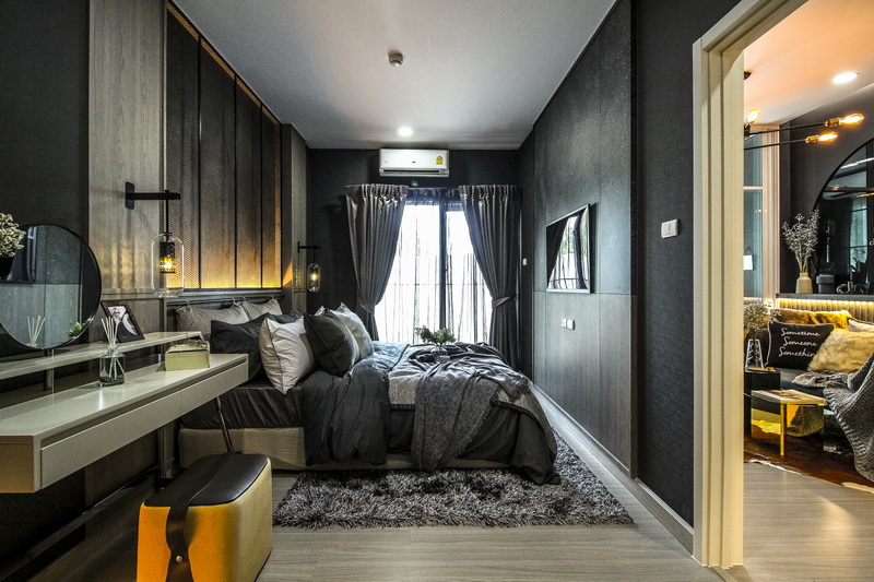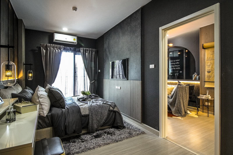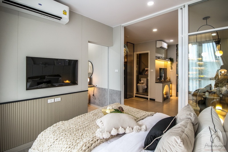 ถัดเข้าไปที่ด้านในของห้องพักจะเป็นที่ตั้งของห้องนอน แยกส่วนด้วยประตูกระจกบานเลื่อน 3 ตอน พื้นที่ภายในห้องนอนขนาดพอเหมาะ สามารถวางเตียงนอน ขนาด 5-6 ฟุต และ โต๊ะหัวเตียงขนาดกะทัดรัด 1 คู่ได้ พื้นที่รอบ ๆ เตียงยังมีเหลือพอประมาณ ให้เดินเข้า-ออกได้อย่างสะดวก ติดกับห้องนอน จะเป็น “Favorite Corner” ห้องอเนกประสงค์ รองรับ Work Form Home หรือ ทำเป็น Walk-in Closet สำหรับวางตู้เสื้อผ้า และ โต๊ะเครื่องแป้ง