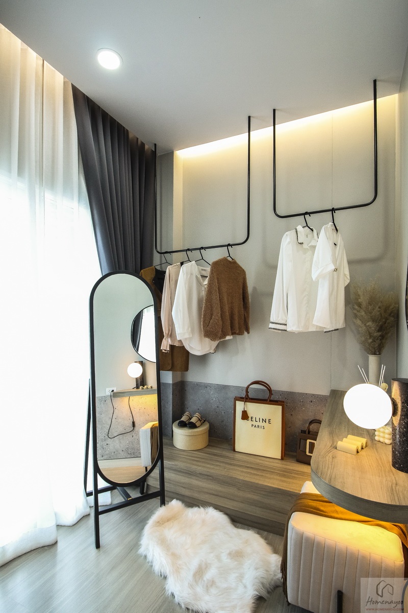 ภายใน Favorite Corner ถูกตกแต่งให้เป็น Walk-in Closet มาให้ดูเป็นแนวทาง ในส่วนของห้องจริง เราสามารถปรับฟังก์ชันการใช้งานให้ตอบโจทย์การอยู่อาศัยของเจ้าของห้องได้เลย ไม่ว่าจะเป็นห้องทำงานแบบ Work Form Home, ห้องอ่านหนังสือ หรือ ห้องเก็บของก็ได้ค่ะ