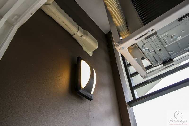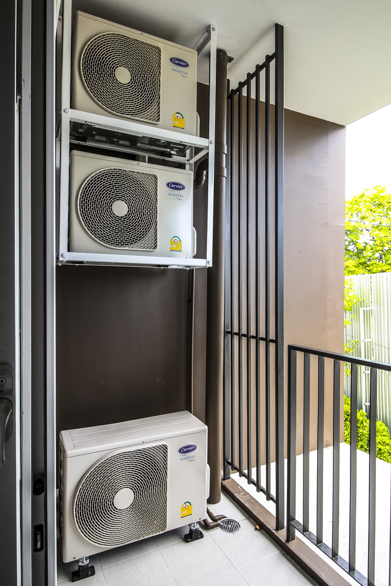 มองขึ้นไปที่ด้านบนติด CDU ไว้ 2 ตัว ปล่อยลมร้อนออกไปที่ด้านนอก ทำให้เวลาใช้งานตรงระเบียง ไม่โดนลมร้อน มีการติดกริลเบี่ยงทิศทางลมแอร์ให้อีกชั้น มองจากภายนอกเข้ามาดูสวยงามเป็นระเบียบ