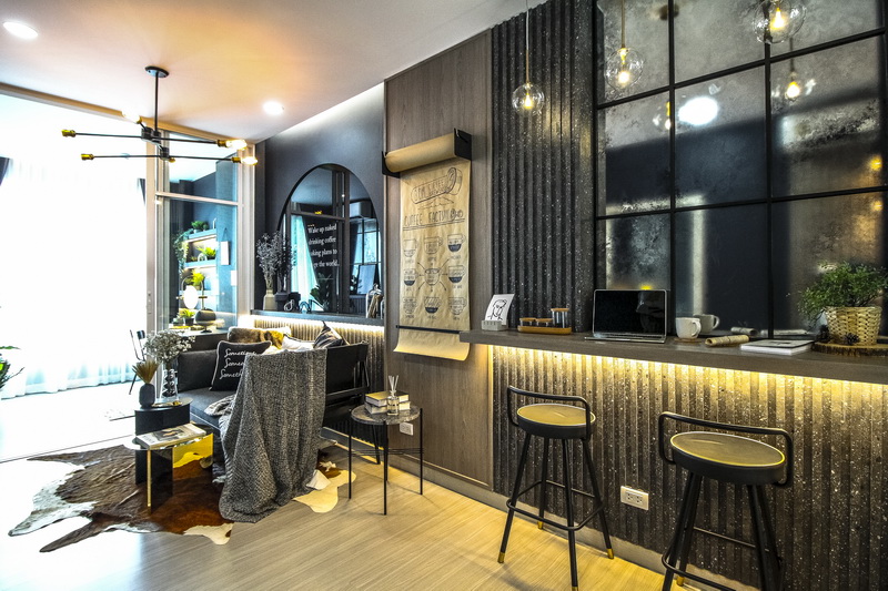 โครงการตกแต่งเป็นมุมทานอาหาร-มุมทำงานมาให้ดูเป็นไอเดีย โดยทำการบิวท์อินเคาน์เตอร์บาร์ตัวยาว แบบนั่งได้ 2 คน ห้องจริงเราสามารถวางเป็นโต๊ะกินข้าวลอยตัว หรือ โต๊ะทำงานลอยตัวชิดผนังก็ทำได้ ผนังด้านล่างติดเต้าเต้าเสียบปลั๊กไฟ รองรับการต่อเครื่องใช้ไฟฟ้าต่าง ๆ มาให้เรียบร้อยค่ะ