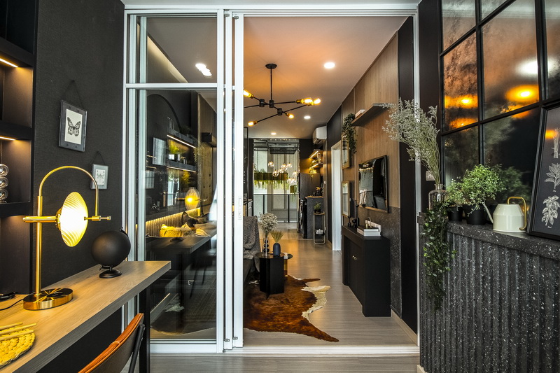 เปิดประตูเข้ามาจะเจอกับครัวเปิด ต่อเนื่องไปเป็น Living Area ที่รวมพื้นที่ห้องนั่งเล่น และ มุมรับประทานอาหารเข้าไว้ด้วยกัน ถัดเข้าไปที่ด้านในสุดเป็นห้องอเนกประสงค์ ที่รองรับเตียงนอน 3.5 ฟุต หรือ ทำเป็นห้องทำงานได้แบบ Work Form Home ได้ ในห้องนี้จะได้หน้าต่างกระจกชุดใหญ่ เปิดรับแสงแดดจากธรรมชาติได้เต็มที่