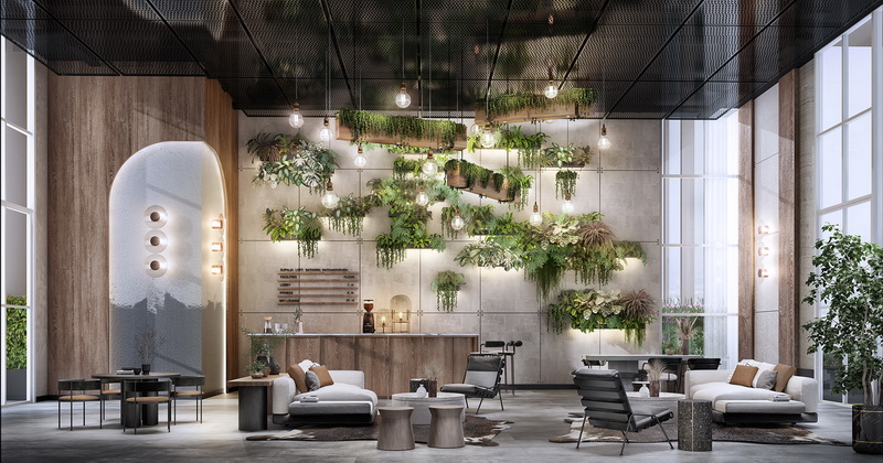 ภาพจำลองบรรยากาศ Lobby & Community Area พื้นที่ขนาดใหญ่ ที่ใช้การเข้า-ออกผ่านระบบ Touchless : Face Scan และประตูอัตโนมัติ เพื่อลดการสัมผัสจากเชื้อโรค และ โรคติดต่อ สำหรับพื้นที่ภายใน Lobby & Community Area ถูกออกแบบมาในสไตล์โมเดิร์น ผสมผสานกับวัสดุธรรมชาติ และ วัสดุเดิมที่ไม่ทำสีตกแต่ง