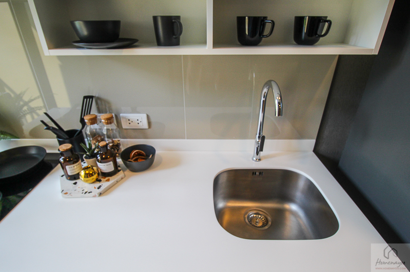 ได้อ่างล้างจานแบบหลุมเดียวพร้อมฝังท็อปมาให้ของ Franke ท็อปเคาน์เตอร์จะเป็นหินสังเคราะห์ ผนังด้านในจะกรุกระเบื้องมาให้ ทำความสะอาดง่ายดี ส่วน Hob & Hood โครงการไม่ได้แถมให้นะครับ เราสามารถติดตั้งเพิ่มเองได้ในภายหลัง