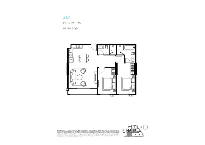 แปลนห้องพักแบบ 2 Bedroom ขนาด 86.40 ตร.ม.