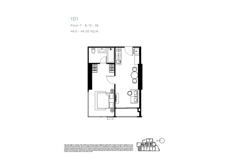 แปลนห้องพักแบบ 1 Bedroom ขนาด 46-46.20 ตร.ม.