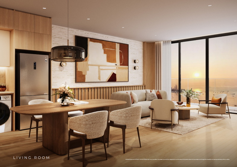 ทุกรายละเอียดได้รับการออกแบบอย่างประณีต ทั้งผนังโค้งมน โทนสีอบอุ่น และพื้นผิวลายหินธรรมชาติ เพื่อสร้างประสบการณ์การอยู่อาศัยที่กลมกลืนกับความงามและความผ่อนคลายตามสไตล์ของพัทยา ผู้อยู่อาศัยจะได้ดื่มด่ำกับบรรยากาศอันสงบ พร้อมวิวพาโนรามาของหาดพัทยา หาดวงศ์อมาตย์ และทัศนียภาพเมืองพัทยาที่ทอดยาวสุดสายตา