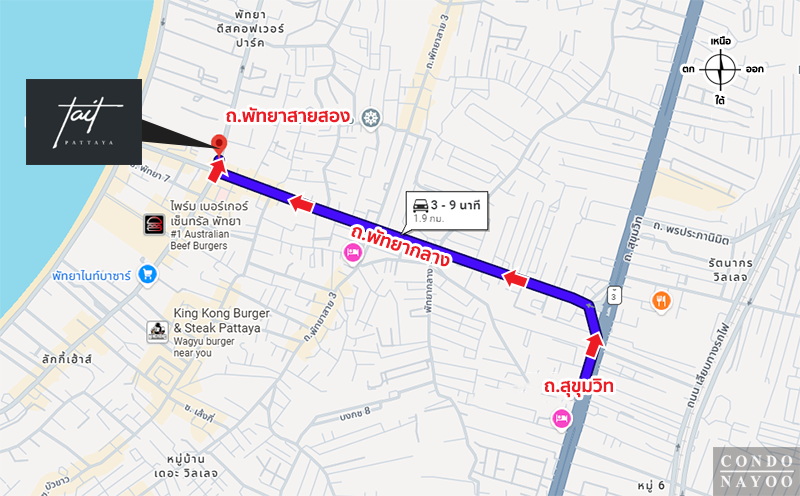 ถนนสุขุมวิท ⇒ ถนนพัทยากลาง ⇒ ถนนพัทยาใต้ ⇒ ถึงโครงการ Tait พัทยา