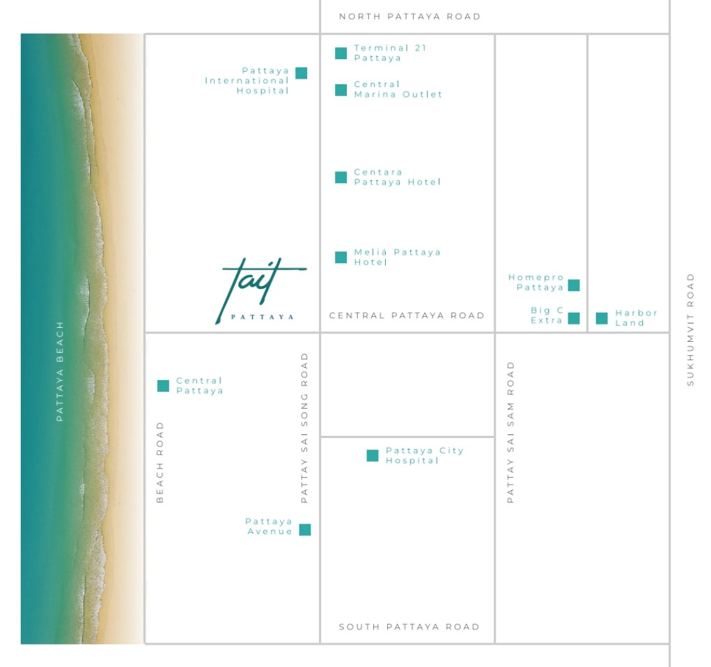 Tait พัทยา คอนโดมิเนียมมิกซ์ยูสแลนด์มาร์คแห่งใหม่ จาก Raimon Land ที่ต่อยอดความสำเร็จจากโครงการ Tait Sathorn 12 โครงการตั้งอยู่ในทำเลศักยภาพสูงย่านพัทยากลาง บนถนนพัทยาสาย 2 ห่างจากชายหาดเพียง 300 ม.* เข้าถึงศูนย์การค้าชั้นนำได้อย่างสะดวก ทั้ง Central Pattaya และ Terminal 21 Pattaya พร้อมร้านอาหารและแหล่งไลฟ์สไตล์หลากหลายในระยะเดินถึง เหมาะสำหรับผู้ที่ต้องการใช้ชีวิตหรูริมทะเล