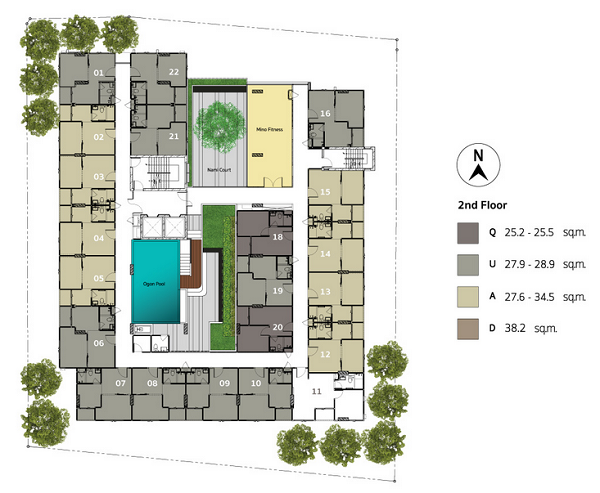 | ลักษณะห้องและขนาดห้อง | – 1 Bedroom : 25-34 ตร.ม. – 2 Bedrooms : 38 ตร.ม. |