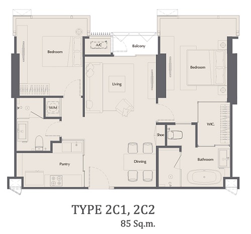 ห้องที่สองที่พาไปสำรวจกันเป็นห้องแบบ 2 ห้องนอน TYPE-B,D,E ขนาด 82-84 ตร.ม. จุดเด่นคือเป็นห้องหน้ากว้าง ให้ความรู้สึกกว้างขวางเหมือนอยู่บ้าน ส่วนต่างๆในห้องรับแสงธรรมชาติได้มาก จัดส่วน Public อย่างห้องนั่งเล่นและห้องอาหารอยู่ติดระเบียง, และห้องนอนทั้งสองห้องอยู่คนละฝั่งกัน ทำให้ห้องนอนสองห้องมีระยะห่างกัน ทำให้มีความเป็นส่วนตัวมากขึ้น