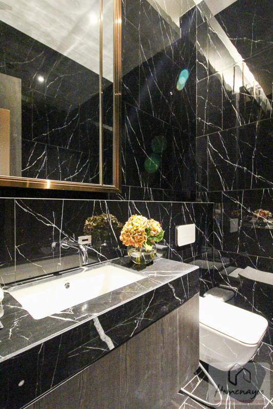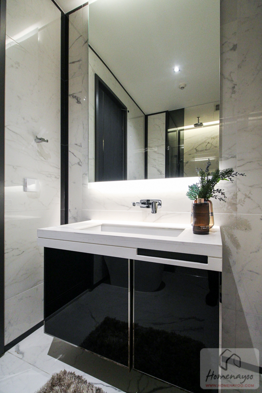 จาก Walk in closet จะมีประตูเชื่อมไปห้องน้ำ จะเห็นว่าพื้นห้องน้ำในห้องนอนเป็นกระเบื้องลายหินอ่อนสีขาวขีดเทาแบบเดียวกันกับห้องน้ำอีกห้อง