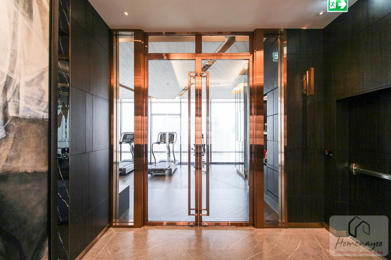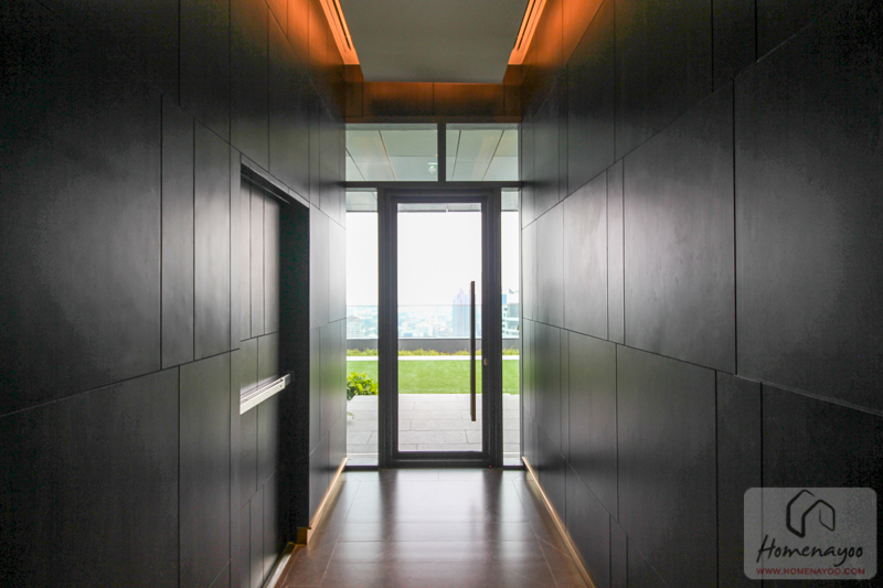เพดานส่วนทางเข้าห้องมีดรอปความสูงผ้าเพดานลงมาประมาณ 15 เซนติเมตร เพื่อเดินงานระบบ และแอร์แบบคอนซีล หรือแอร์ฝังเพดานประตูทางเข้าออกห้องมี Digital Door lock มาให้