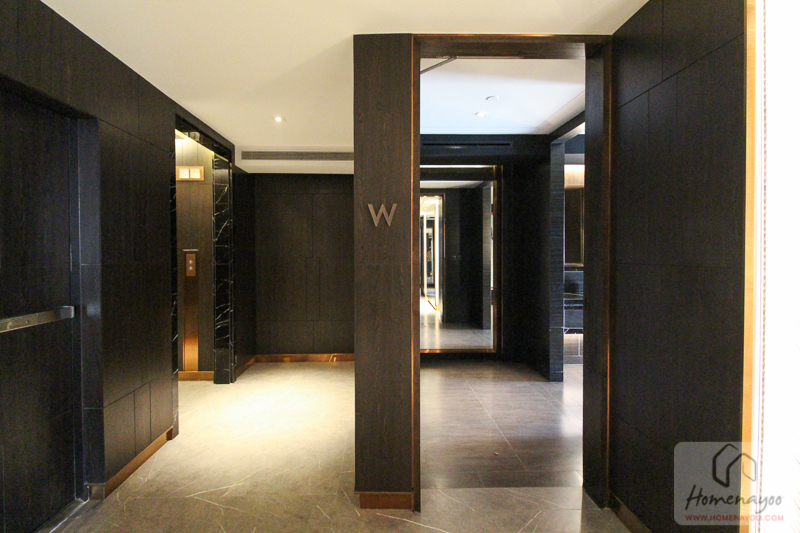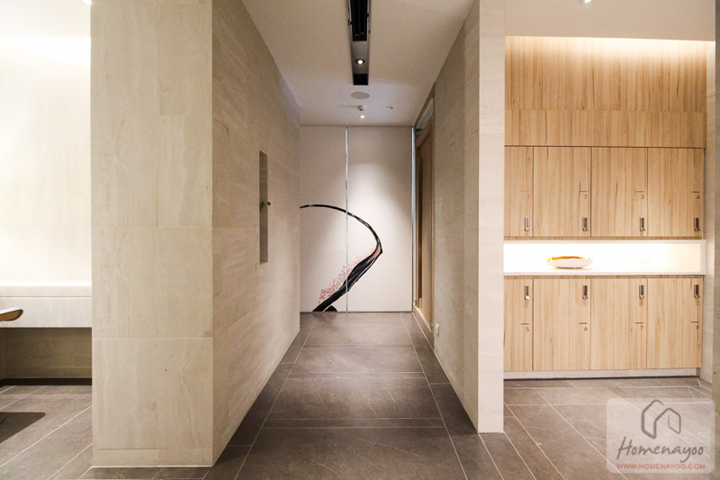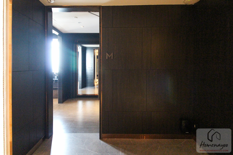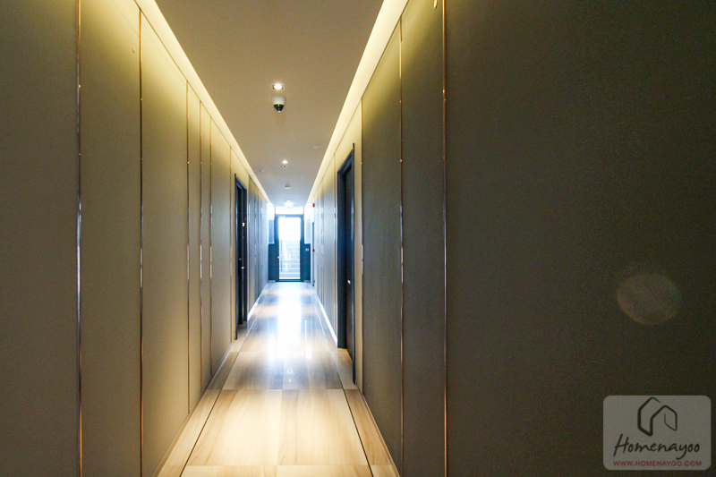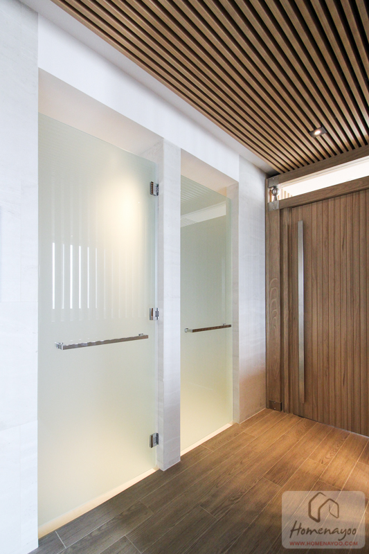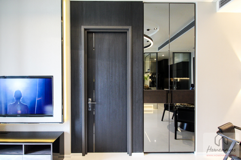 ประตูห้องแบบ Air post และ Digital Door Lock ของ Yale แบบเดียวกันกับห้องตัวอย่างห้องแรกค่ะ เข้ามาเป็นส่วน Foyer สองฝั่งของประตูขนาบด้วยช่องเก็บของพร้อมหน้าบานปิดได้ตามที่เห็น ฝั่งนึงเป็นช่องเก็บเครื่องซักผ้า อีกฝั่งนึงเป็นชั้นเก็บรองเท้า