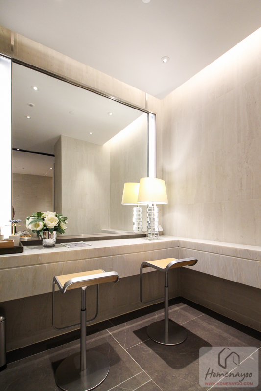 ส่วนอ่างล้างมือทำเคาน์เตอร์หินสังเคราะห์พร้อมชั้นวางของด้านล่างมาให้กว้างขวาง กระจกเงาพร้อมไฟซ่อนของจริงได้ตามนี้ ติดเครื่องทำน้ำร้อนมาให้เรียบร้อย