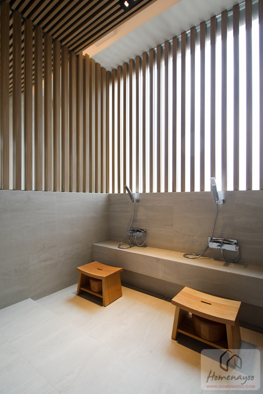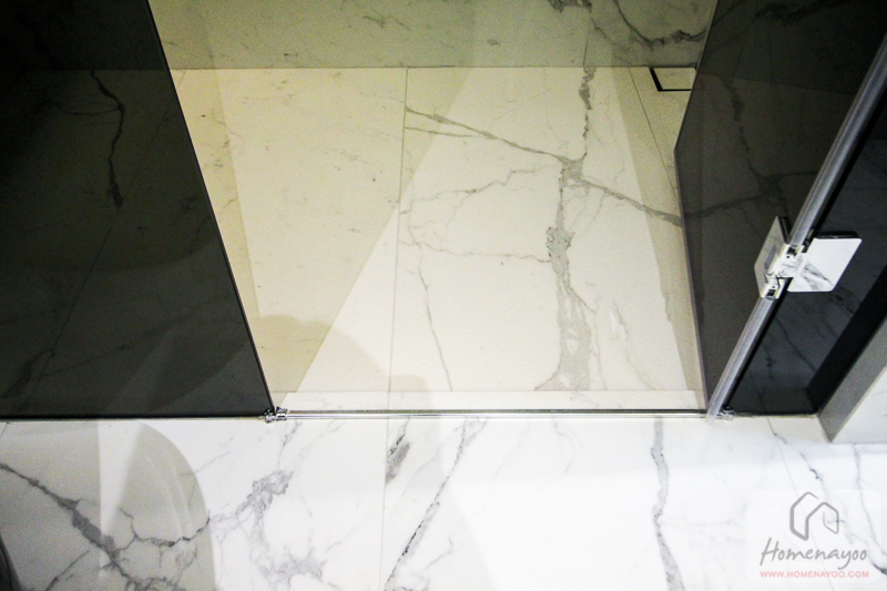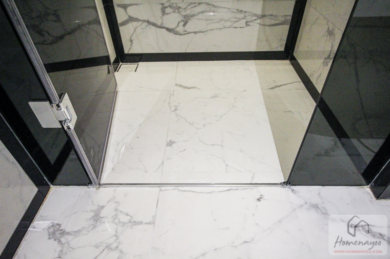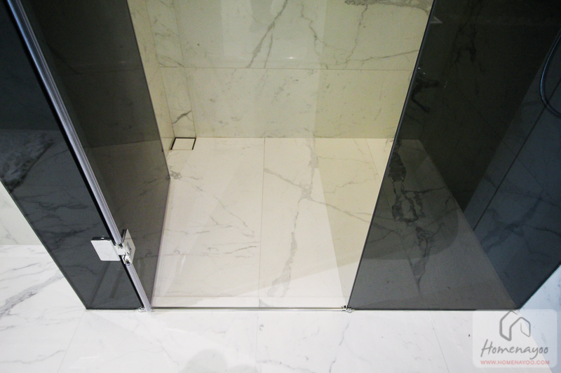 ส่วนอาบน้ำมีฉากกั้นห้องมาให้เป็นกระจกเทมเปอร์ทำสีดำ พื้นส่วนเปียกลดระดับลงไปประมาณ 5 cm. และมีรางสแตนเลสเดินที่ขอบเพื่อกั้นระหว่างพื้นส่วนเปียกส่วนแห้ง