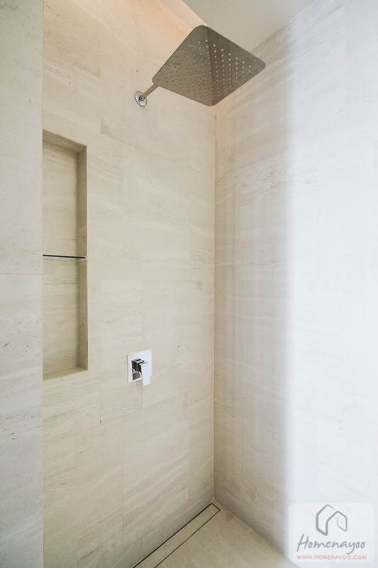 ส่วนห้องอาบน้ำนอกจากฝักบัวจะติด Rain Shower มาให้ด้วย นอกจากนี้ที่มุมห้องอาบน้ำมีที่วางของขนาดกว้างพอสมควรติดมาให้ สามารถใช้วางครีมอาบน้ำ แชมพู ครีมนวดได้