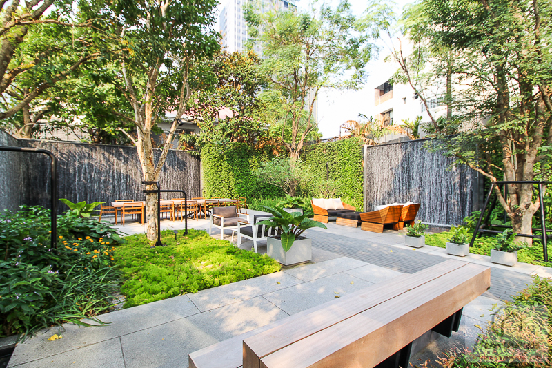 ภายในสวน Green Quarter จัด Landscape มาสวยงามร่มรื่น บรรยากาศแตกต่างจากสวนอื่นๆตรงที่มีกำแพงน้ำตกและ Vertical ล้อมรอบ สร้างบรรยากาศที่โอบล้อมไปด้วยธรรมชาติด้วยเสียงของน้ำตก ภายในทำทางเดินและวางที่นั่งพักผ่อนมาให้หลายแบบ