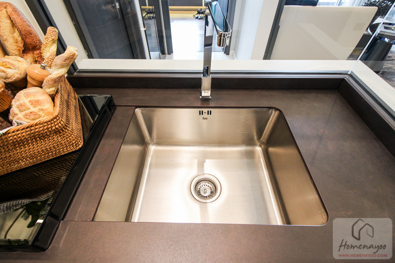 ส่วนอ่างล้างจานเป็นอ่างสแตนเลสหลุมสี่เหลี่ยม จะเห็นว่าบนท้อปครัว ข้างอ่างล้างจานทำพื้นลาดเอียงนิดๆให้ใช้วางพักจานชามที่เพิ่งล้างเสร็จได้ โดยน้ำจะไหลลงอ่างอีกทีนั่นเอง ก็อกน้ำเป็นโครเมียมหมุนไปมาซ้ายขวาได้ หน้าบานเป็นไฮเพรสเชอร์ลามิเนตสีขาว ฝั่งนี้มีกระจกเข้ามุมเป็นช่องแสงธรรมชาติให้เราสามารถล้างจานหรือเตรียมอาหารไปและดูทีวีในห้องนั่งเล่นผ่านกระจกใสที่เป็นผนังของครัวปิดได้