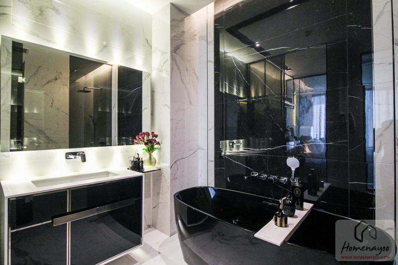 ชุดสุขภัณฑ์ได้ของ KASCH พร้อมอ่างอาบน้ำรูปไข่สีดำ มีฉากกั้นห้องน้ำเป็นกระจกเทมเปอร์พร้อมฝักบัวและ Rain Shower มาให้ เพดานห้องชั้น 5-6 สูง 2.75 m. ถ้าเป็นห้องที่อยู่ชั้น 7 ขึ้นไปเพดานสูง 2.9 m. ซึ่งถือว่าให้มาสูงโปร่งเลย ไฟติดเพดานเป็นไฟดาวน์ไลท์ ผนังติดวอลเปเปอร์มาให้ พื้นห้องส่วนห้องนั่งเล่น ห้องรับประทานอาหาร และห้องครัวเป็นแกรนิตโต้สีขาวขนาด 60×60 ซม. ส่วนห้องนอนเป็นพื้น Engineering wood