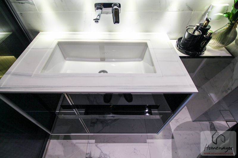 มีพื้นที่ว่างให้วางชั้นวางของเพิ่มข้างอ่างล้างมือได้อีก ท้อปเคาน์เตอร์อ่างล้างมือเป็นหินสังเคราะห์สีขาวขีดเทา จะเห็นว่ามีพื้นที่ว่างให้วางของรอบอ่างได้เยอะ