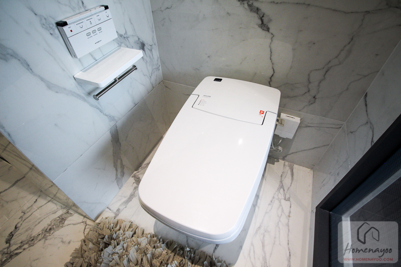 ด้านข้างโถสุขภัณฑ์ มีสแตนเลสไว้ให้แขวนกระดาษชำระ ด้านบนมีที่วางของ ใช้วางมือถือหรือหนังสือได้ และมีแผงควบคุมระบบโถสุขภัณฑ์ Washlet ของ KASCH