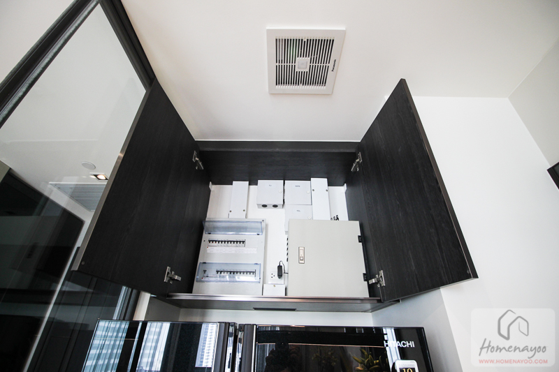 เปิดชั้นลอยเหนือตู้เย็นและเคาน์เตอร์ติดตู้เย็นให้ดู จะเห็นระบบควบคุมไฟอยู่ที่ผนังส่วนนี้