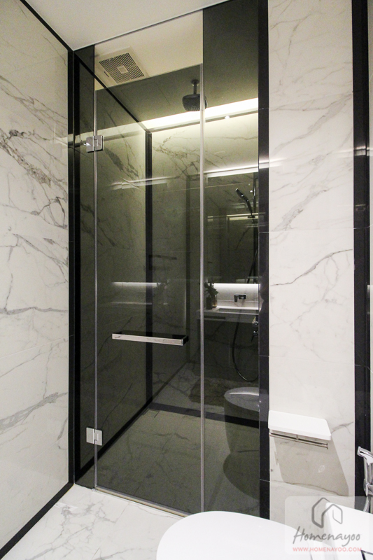 ส่วนอาบน้ำมีฉากกั้นห้องมาให้เป็นกระจกเทมเปอร์ทำสีดำ มือจับเป็นสแตนเลสรูปตัว U ใช้แขวนผ้าเช็ดตัวได้