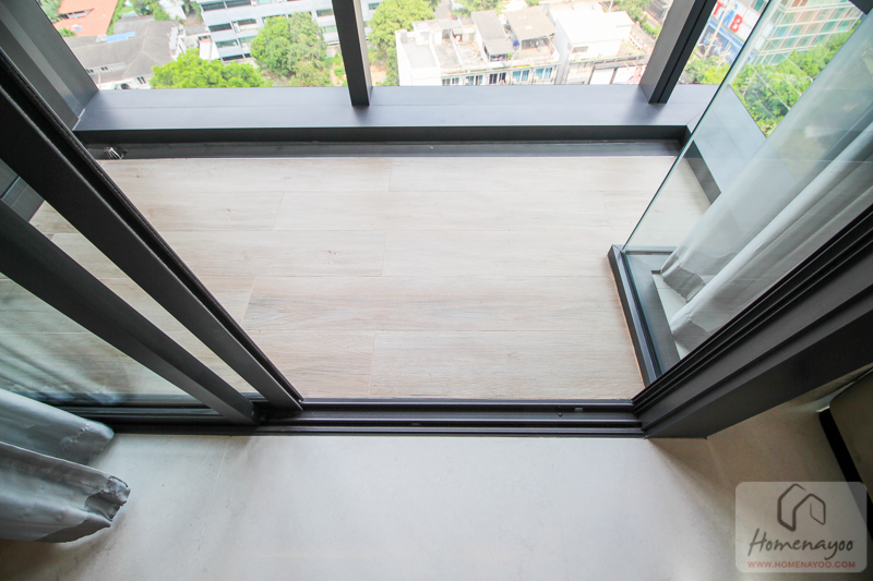 พื้นระเบียงลดระดับลงต่ำกว่าพื้นห้องประมาณ 5 ซม. ตัวพื้นห้องปูกระเบื้องลายไม้มาให้ มีเตรียมงานระบบ เซาะร่องสำหรับระบายน้ำและท่อระบายน้ำมาให้เรียบร้อย