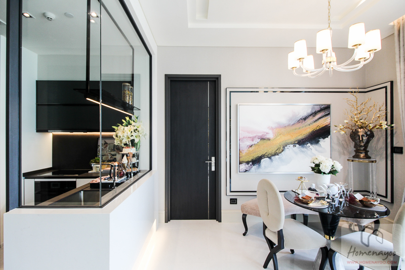 เปิดประตูเข้าห้องมาจะเจอส่วนครัวปิดฝั่งซ้าย ห้องน้ำฝั่งขวา มองตรงไปเป็นห้องนั่งเล่นและห้องรับประทานอาหารติดระเบียงแบบนี้