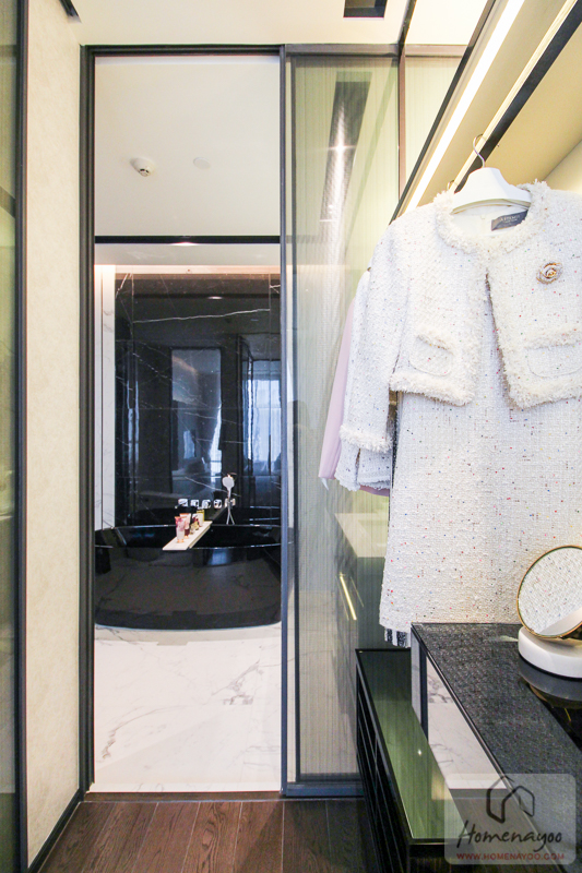 มองไปที่ฝั่งประตูทางเข้าห้องน้ำ จะเห็นมุม Walk in closet และทางเข้าห้องน้ำในห้องนอน สังเกตว่าผนังข้างประตูทางเข้าจะเป็นผนังกระจก 2 ชั้น ตรงกลางเป็นลายผ้า ช่วยดึงแสงธรรมชาติเข้าไปในห้องน้ำและส่วน Walk in closet และมีแอร์ซ่อนฝ้าติดตั้งมาให้ได้ตามที่เห็น
