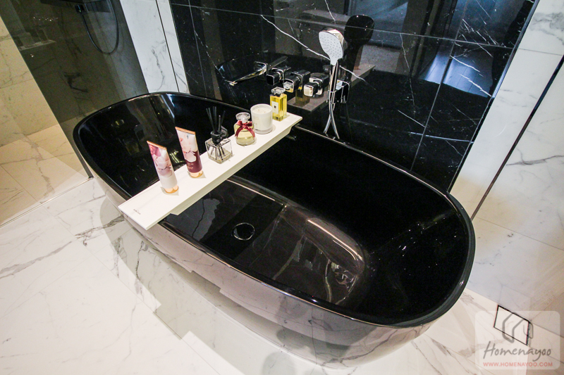 เป็นอ่างอาบน้ำรูปทรงโค้งมนสีดำ จะเห็นว่ามีชั้นวางของพาดอยู่บนตัวอ่าง ใช้วางสบู่ แชมพูอาบน้ำ หรืออุปกรณ์ต่างๆได้