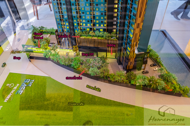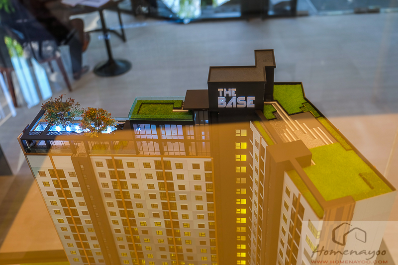 สิ่งอำนวยความสะดวก – Facility หลักๆของโครงการอยู่ที่ชั้น 1 , 5 และ 28-30 ที่ชั้น 1 มีสวนหย่อม ตกแต่งทางเดินเข้าออกโครงการเป็น Green Tunnel ยาวเชื่อมเข้าไปถึง Lobby ตัว Green Tunnel ออกแบบเป็นโครงหลังคา สลับกับลวดสลิงขึงให้มีไม้เลื้อย เพื่อปรับเปลี่ยนอารมณ์เมื่อเดินเข้าโครงการมา มีสนามเด็กเล่น พื้นที่ด้านหลังที่ติดคลองจัดเป็นที่นั่งพักผ่อน ภายในอาคารมีโถง Lobby และ Co-working space ที่ปรับเปลี่ยนเป็นห้องดูหนังได้ในตัว ที่ชั้น 5 มีสวนส่วนกลาง ที่ชั้น 28 มีสระว่ายน้ำระบบเกลือยาว 40 ม. มีฟิตเนสแบ่ง 2 ชั้น โครงการของแสนสิริที่ยกส่วนกลางไปไว้ชั้นบนๆนี่หายากนะครับ แบรนด์สูงกว่า THE BASE ยังไม่ค่อยมีเลย ตัวนี้ถือว่าจัดเต็มพอสมควรครับ