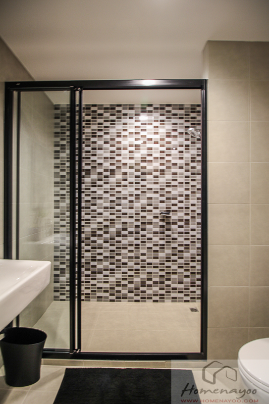 อีกฝั่งเป็นพื้นที่ส่วนเปียก ได้ฉากกั้นบานเลื่อน 3 ตอน เฟรมกระจกสีดำ