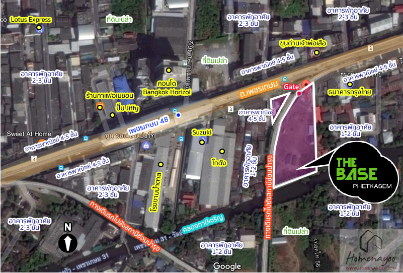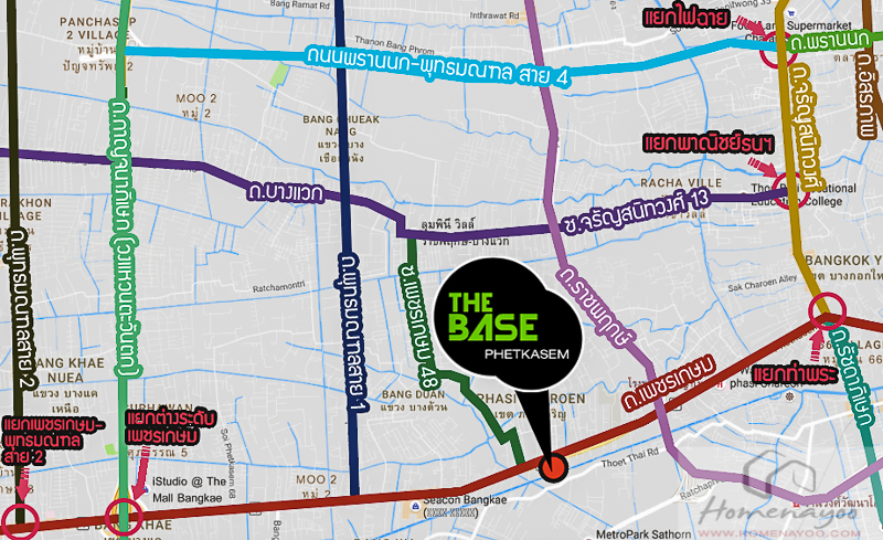 ทำเลที่ตั้งโครงการ – THE BASE เพชรเกษม ตั้งอยู่ในย่านฝั่งธน พื้นที่รอบๆโครงการส่วนใหญ่เป็นชุมชนที่พักอาศัย ริมสองฝั่งทางถนนเพชรเกษมจะเป็นอาคารพาณิชย์ตึกแถว มีอาคารสำนักงานบ้าง ส่วนในซอยย่อยก็จะเป็นบ้านพักอาศัยของชุมชนย่านนี้ ความอุดมสมบูรณ์รอบๆโครงการออกแนวชุมชนมีร้านค้าร้านอาหารริมสองฝั่งทางถนนเพชรเกษมเป็นระยะๆ ร้านโชห่วย ร้านสะดวกซื้อก็มีครับ ตลาดสดใกล้ๆมีตลาดบางแค ส่วนห้างสรรพสินค้าใกล้ๆมีซีคอนบางแค , The Mall , Tesco Lotus , Big C ร้านอาคารแนวๆนั่งชิวมีตรงเส้นราชพฤกษ์หลายร้านให้เลือก รวมไปถึงคอมมูนิตี้มอลล์ด้วยครับ