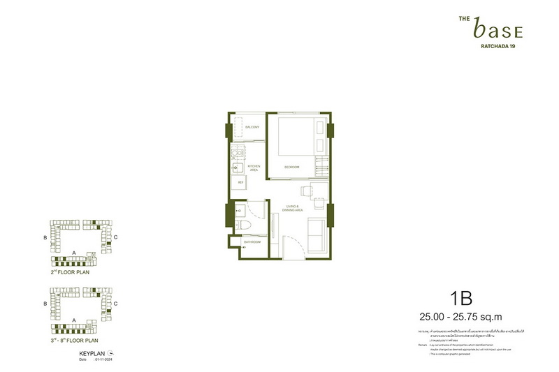 แปลนห้องพัก 1 Bedroom : TYPE 1B ขนาด 25.00-25.75 ตร.ม.