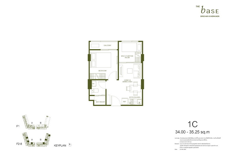 แปลนห้องพัก Type 1C : 34.00-35.25 ตร.ม.